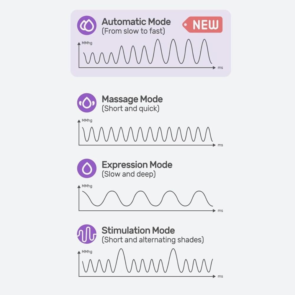 • الوضعيات Modes (4): تدليك (Massage)، شفط (Expression)، تحفيز (Stimulation)، تلقائي (Automatic)